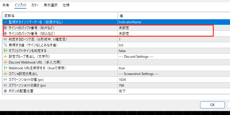 バッファをみないので「サインバッファの番号(BUYなど)」と「サインバッファの番号(SELLなど)」を未設定にして、「オブジェクトサインも判定する」をtrueに設定します。
