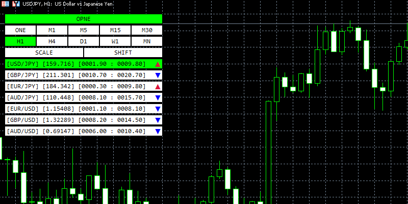 price-checkは、主要20通貨ペアの現在価格・実体幅・高安幅・▲▼表示をボタン上でひと目で確認できる、MT4/MT5専用のオリジナルインジケーターです。